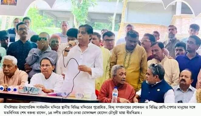 দীঘলিয়ার রাঁধাগোবিন্দ সার্বজনীন মন্দিরে স্থানীয় বিভিন্ন মন্দিরের পুরোহিত, হিন্দু সম্প্রদায়ের লোকজন ও বিভিন্ন শ্রেণি-পেশার মানুষের সঙ্গে মতবিনিময়কালে ১৪ দলীয় জোটের নেতা মোফাজ্জল হোসেন চৌধুরী মায়া বলেন, ‘দীঘলিয়ার সাহাপাড়ায় হামলার সঙ্গে যারা জড়িত, তাদের ছাড় দেওয়া হবে না। বর্তমান সরকারের উন্নতি ও অগ্রযাত্রা বাধাগ্রস্ত করতে একটি চিহ্নিত গোষ্ঠী এসব অপকর্ম করেছে। সাম্প্রদায়িক সম্প্রীতি বজায় রাখার প্রত্যয়ে প্রধানমন্ত্রী শেখ হাসিনার নেতৃত্বে বর্তমান সরকার অঙ্গীকারবদ্ধ। সাম্প্রদায়িক শক্তির বিরুদ্ধে ১৪ দল মাননীয় প্রধানমন্ত্রীর নির্দেশনায় সব সময় আপনাদের পাশে থাকবে। কে সংখ্যালঘু বা কে সংখ্যাগুরু এসব কোনো হিসাব নাই। হিসাব একটাই, আমরা বাংলাদেশের নাগরিক, আমরা সবাই সমান। ১৪ দল সাম্প্রদায়িকতার বিরুদ্ধে ঐক্যবদ্ধ ছিল, এখনো আছে, ভবিষ্যতেও থাকবে।