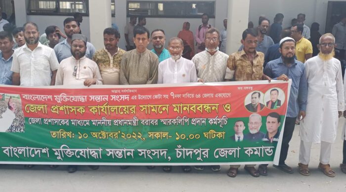 চাঁদপুরে মুক্তিযোদ্ধা সন্তান সংসদের মানববন্ধন ও স্মারকলিপি পেশ নিজস্ব প্রতিনিধি : সরকারি চাকরিতে ৩০ শতাংশ কোটা পুনর্বহাল ও সংরক্ষণ এবং আলাদা নিয়োগ বিক্রি ও প্রোমশন বঞ্চিত বীর মুক্তিযোদ্ধার সন্তানদেরকে অনতিবিলম্বে
