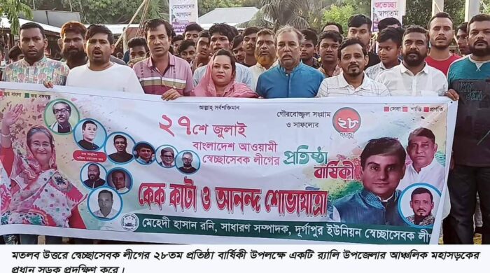 নিজস্ব প্রতিবেদকঃ বিশাল শোডাউন বর্ণাঢ্য র ্যালি   ও নানান কর্মসুচি পালনের  মাধ্যমে ২৮ তম প্রতিষ্ঠা বার্ষিকী পালন করলো চাঁদপুর জেলা স্বেচ্ছাসেবক লীগ। চাঁদপুর জেলা স্বেচ্ছাসেবক লীগের  ২৮ তম প্রতিষ্ঠা বার্ষিকী