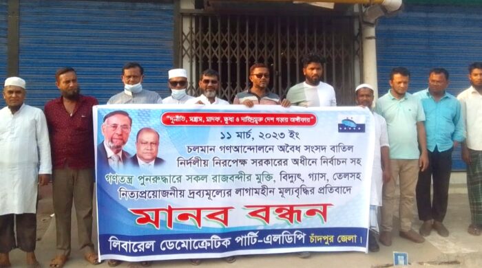 নিজস্ব প্রতিবেদকঃ বিএনপি’র কেন্দ্রীয় কর্মসূচির অংশ হিসাবে চাঁদপুরে আজ শনিবার (১১ মার্চ) বিকালে শহরের হাজী মহসিন রোডে চিত্রলেখা মোড় এলাকায় জেলা বিএনপির উদ্যোগে তেল, গ্যাস ও দ্রব্যমূল্যের ঊর্ধ্বগতির প্রতিবাদ এবং