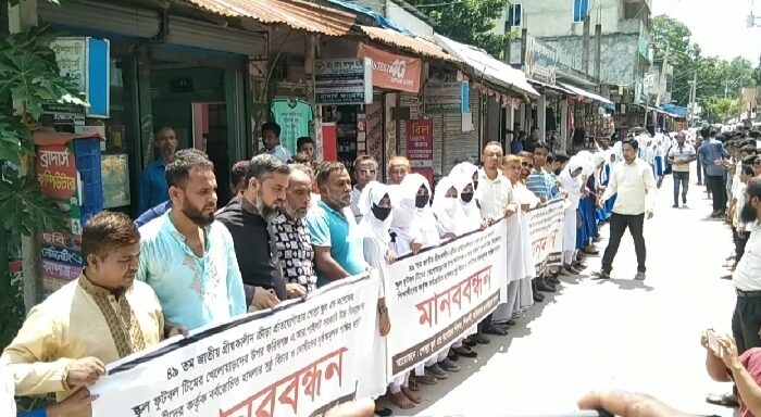 ফরিদগঞ্জ প্রতিনিধিঃ চাঁদপুরের ফরিদগঞ্জ উপজেলায় ফুটবল খেলাকে কেন্দ্র করে স্কুল শিক্ষার্থীদের ওপর হামলার প্রতিবাদে মানববন্ধন করেছেন শোল্লা স্কুল এন্ড কলেজের শিক্ষার্থী, শিক্ষক, অভিভাবক ও এলাকাবাসী। বৃহস্পতিবার (৮ সেপ্টেম্বর) দুপুরে শোল্লা