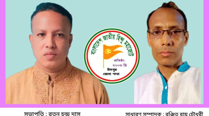 মিজানুর রহমানঃ বাংলাদেশ জাতীয় হিন্দু মহাজোট চাঁদপুর জেলা শাখার ২০২৩-২৫ সালের জন্য পূর্নাঙ্গ কমিটি অনুমোদন দেয়া হয়েছে। এরমধ্যে ১২ সদস্য বিশিষ্ট একটি শক্তিশালী উপদেষ্টা পরিষদ এবং ৮১সদস্য বিশিষ্ট কার্য-নির্বাহী কমিটি